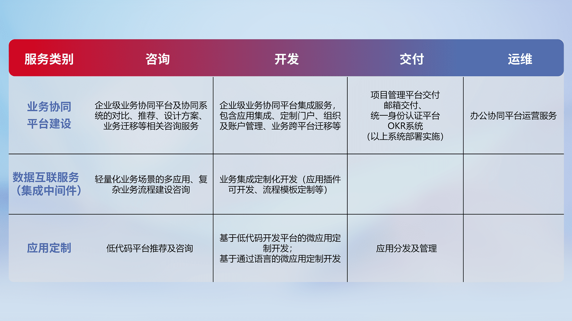针对钉钉、、、、企微、、、、IDaas等平台级产品提供产品的规划、、、方案、、、交付、、、定制化开发等服务,,,,实现如统一协同办公、、、智能客户服务、、、混合会议管理、、智能数据查询、、、、等业务场景,,,实现数字化转型。。。。