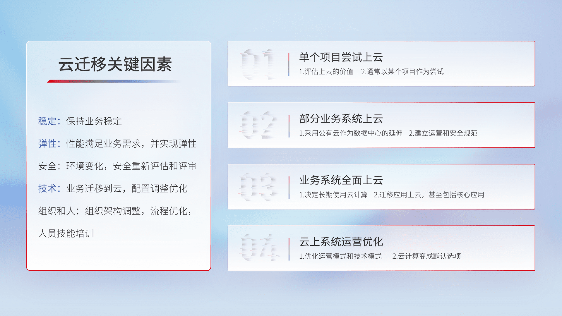 结合实际业务,,从规划设计、、、云平台选型、、云原生改造、、数据迁移、、、、集成交付,,,,迁移全过程为客户识别最佳上云路径,,,,做好风险识别管理,,,,设计网络架构、、身份权限、、、、安全审计合规、、、、操作审计、、、、日志审计、、、、监控告警策略、、多站点容灾设计等,,,,对云上基础设施进行整体规划,,,,提升IT治理水平,,以满足弹性、、高可用、、、高性能的需求。。