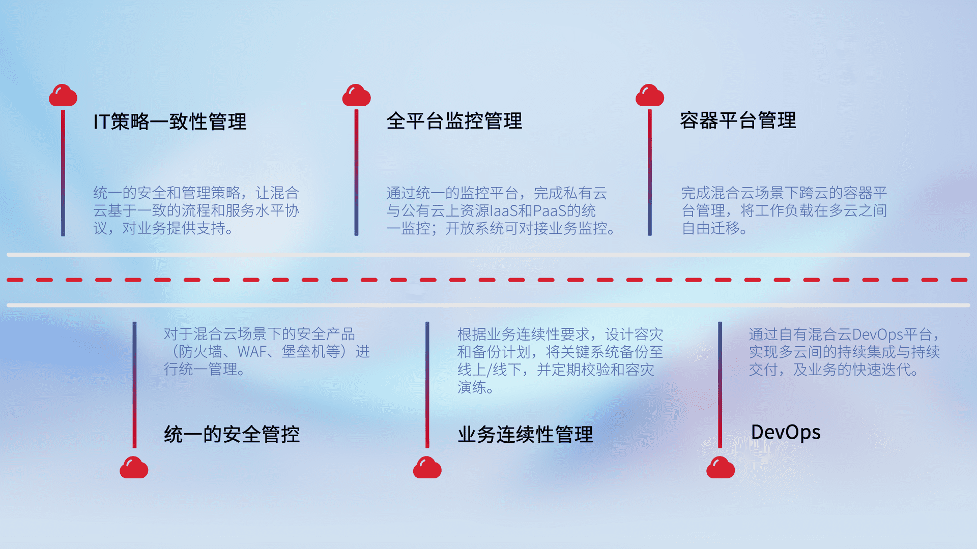 通过多云纳管,,,以统一的资源数据模型把客户的云资源进行抽象和封装,,,进而实现对多云资源的统一操作,,,,保障云资源管理的可靠性、、稳定性与可用性。。。量身定制化运维内容,,,配置、、、、开发运维、、、补丁管理、、、、备份、、、、监控、、、认证和访问管理、、审计和日常巡检等,,,,保障在用云过程中的可靠度,,,稳定度以及高可用率。。。